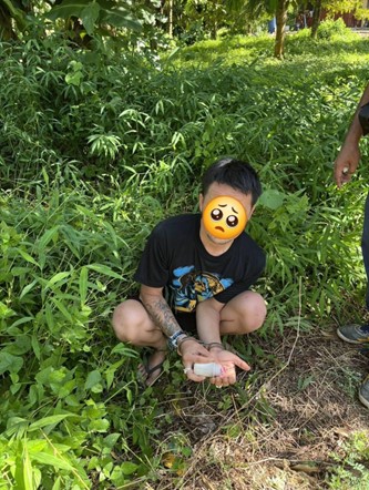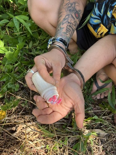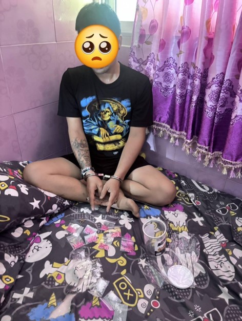 ของกลางรายการที่ 3 บรรจุอยู่ภายในกระปุกสีขาว แบบมีฝาปิด ซึ่งซุกซ่อนอยู่ในพงหญ้าข้างบ้านที่เกิดเหตุ